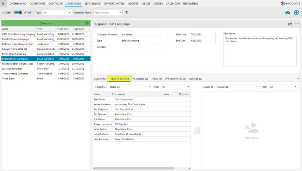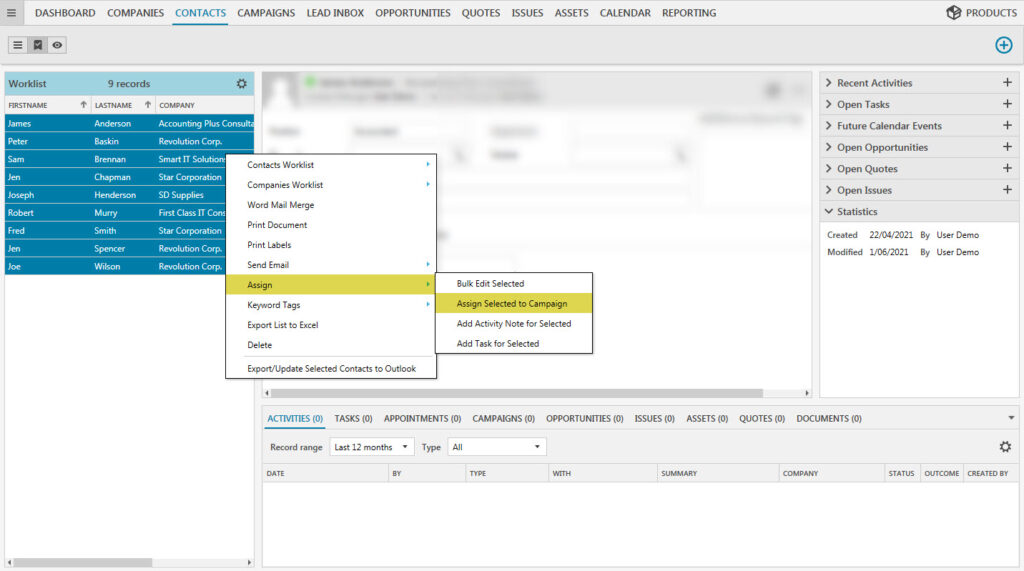 After you create a Legrand CRM Campaign, identify the contacts you want to target using the campaign. We recommend to attach a keyword to contact records or use the Contact Worklist to create a campaign mailing list. After you identify the contacts you want to target, right-click on the contact records and click on ‘Access > Assign Selected to Campaign’.