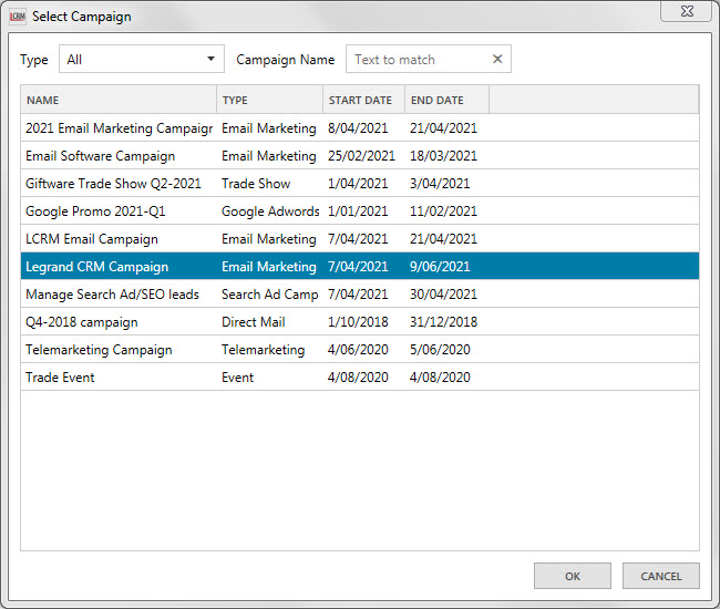 In the ‘Select Campaign’ window, select the campaign that will be used to target the contacts then click ‘OK’.