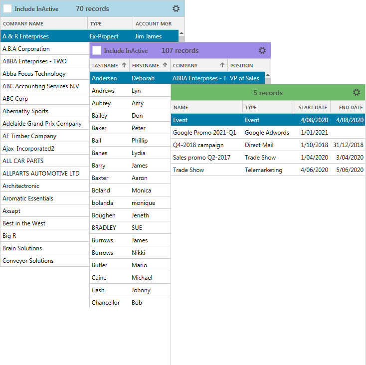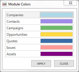 Legrand CRM enables you to change colors of the headers for the following modules: Companies, Contacts, Campaigns, Opportunities, Quotes, Issues and Assets. Assign a color to each module to easily differentiate the modules and various lists.