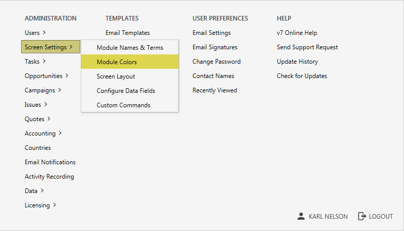 To change the color of the list headers go to the administration panel in Legrand CRM and click on ‘Screen Settings > Module Colors’.