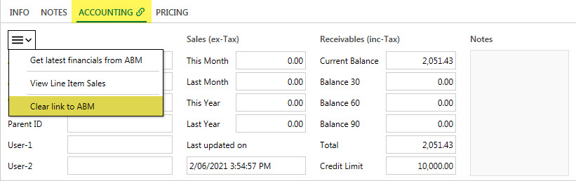 Legrand CRM enables you to remove the link between a Legrand CRM record and a ABM Accounting record. Simply select the Legrand record from the company list and navigate to the ‘Accounting’ tab. Click on the icon shown then select ‘Clear Link to ABM’.