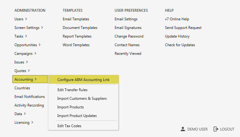 Alternatively, if you decide to change or remove the entire accounting link, go to the administration panel in Legrand CRM and click ‘Accounting > Configure ABM Accounting Link’.