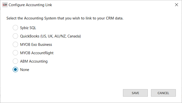 Alternatively, if you decide to change or remove the entire accounting link, go to the administration panel in Legrand CRM. Click ‘Accounting > Configure MYOB AccountRight Link’ then select a different accounting system or ‘None’ then click ‘SAVE’.