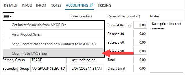 Go to the Companies module and select the company record. In the ‘Accounting’ panel, click on the drop-down menu and select ‘Clear Link to MYOB EXO’.