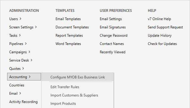 If you decide to change or remove the entire accounting link, go to the administration settings and select Accounting > Configure MYOB EXO Business Link.