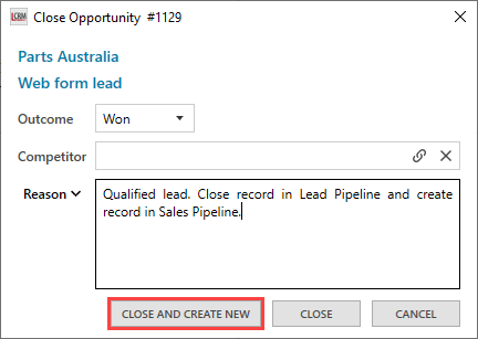 Alternatively, you can click ‘CLOSE AND CREATE NEW’ to close the Opportunity in the current pipeline and create a record in a different sales pipeline.