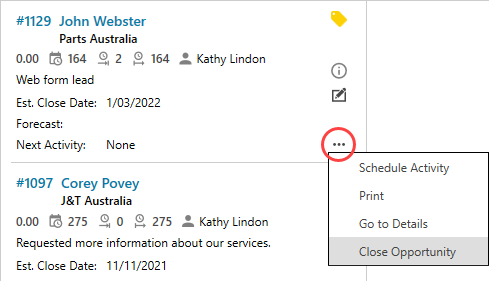 NOTE: You can close Opportunities in any of the Views. If you go to the Table View, double-click on the Opportunity to open the record and click ‘Close Opportunity’. In the Details View, select the Opportunity, click the ellipsis icon and select ‘Close Opportunity’.