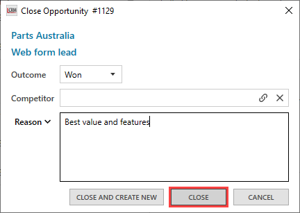 Select an outcome, enter the reason and select ‘CLOSE‘.