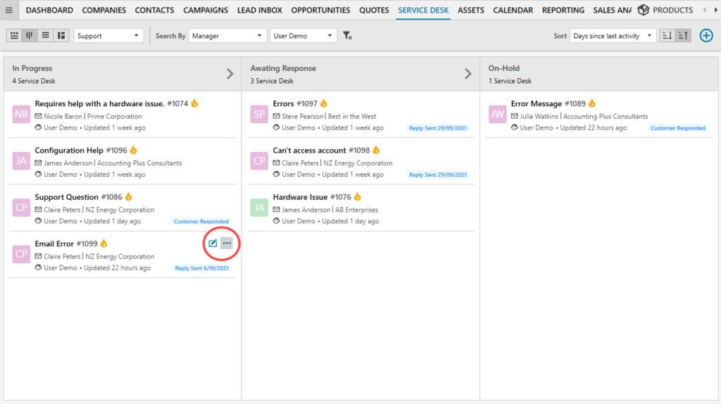 In the Board View, you can close a ticket using the context menu. Hover over the ticket you want to close and click on the ellipsis icon. In the context menu, select Close.