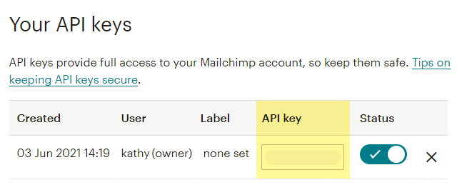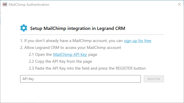Copy the API key from your MailChimp account, paste the API key into the text field and press ‘REGISTER’.