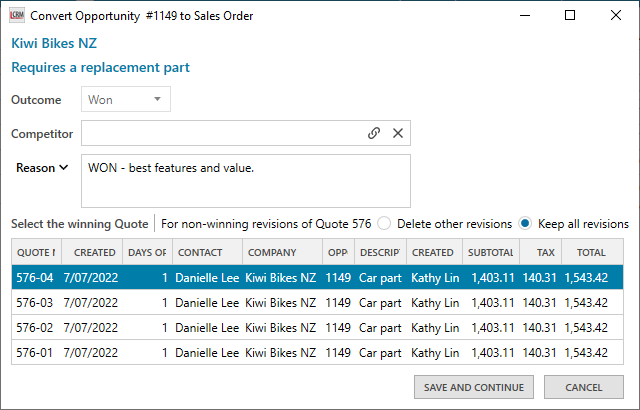 Select the winning quote from the revision list and click ‘SAVE AND CONTINUE’. You can also select whether to ‘Delete other revisions’ or ‘Keep all revisions’.