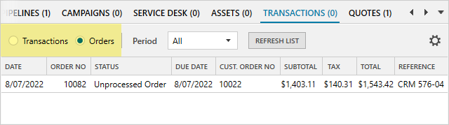 Go to the ‘Transactions’ tab in the company record to see the customer’s transactions and sales orders.
