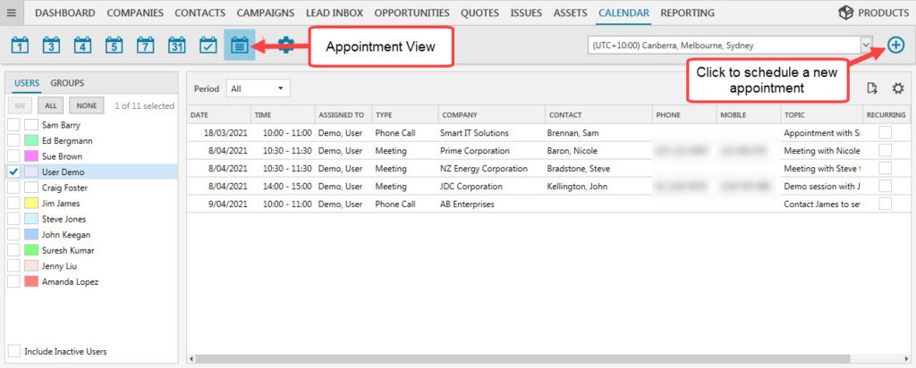 To schedule an appointment in the Calendar module switch to the Appointment View and click on the icon as shown.