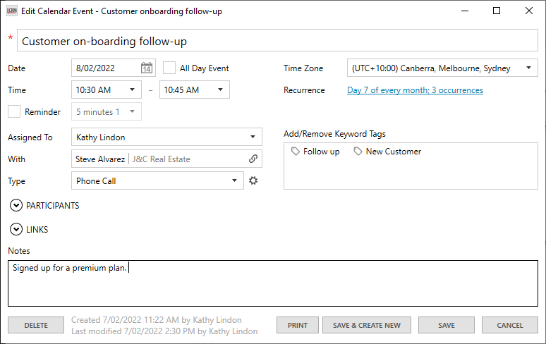 The list values for appointment Type is configurable so that it is relevant to you. Click on the settings icon to populate the drop-down list. Legrand CRM also enables you to attach keywords. For example, you may assign a keywords for appointments that require further action or a follow up.