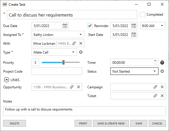 All tasks can be linked to an Opportunity, Campaign or Issue. In addition, you can type in any other notes that may be relevant to the task in the free form text field below. After filling in the relevant fields, click ‘SAVE’ or ‘SAVE & CREATE NEW’ to also record an Activity Note, Task, Appointment, Opportunity or Issue.You can also print the task by simply just clicking ‘PRINT’. Alternatively, click ‘CANCEL’ to discard any changes.