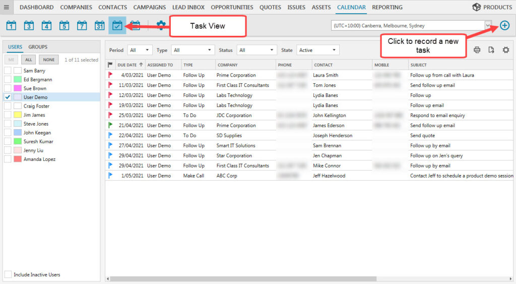 Legrand CRM provides the flexibility for you to record tasks and appointments/calendar events in multiple ways. To record a new task in the Calendar module simply switch to the Task View and click on the icon as shown.