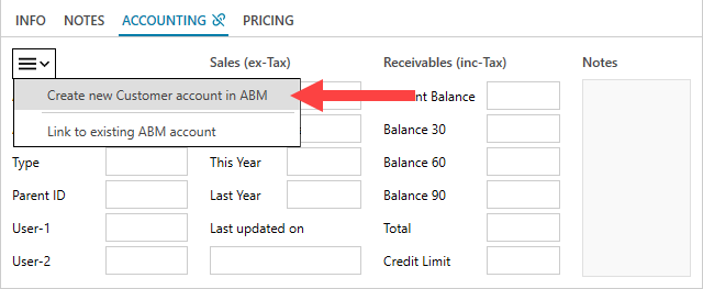 Go to the Companies module to select a company record and click the ‘Accounting’ tab. In the accounting panel, select the drop-down menu and click ‘Create new Customer account in ABM’.