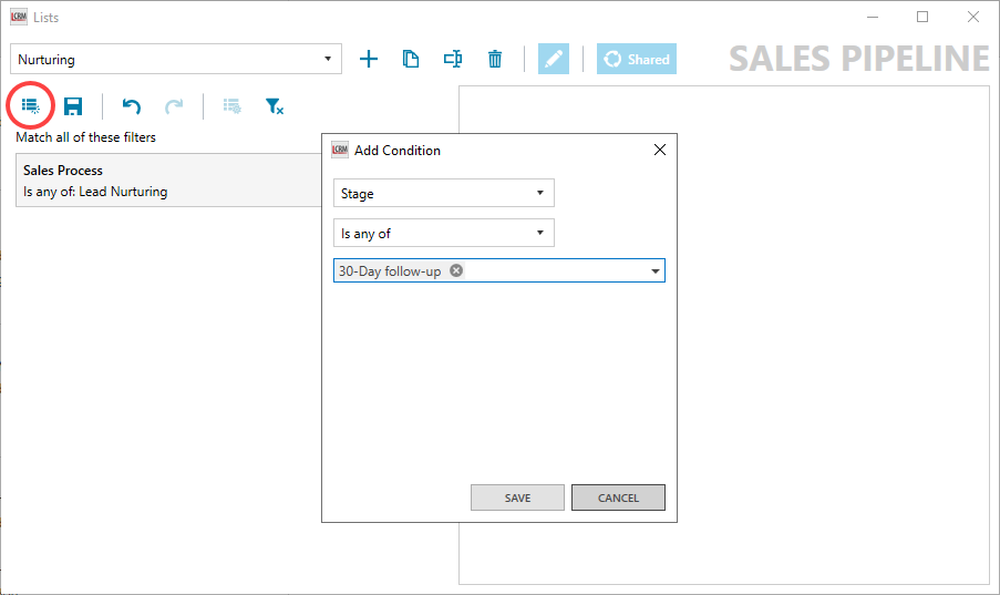 Click on the ‘Add Filter’ icon to add a search condition. Use the drop-down to select a field and click SAVE.