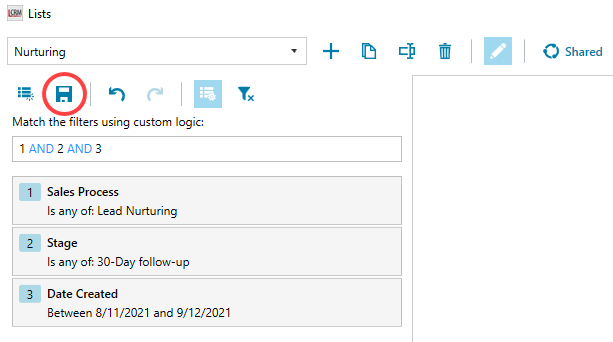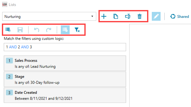 Use the icons to create a new search query, duplicate, rename or delete. Use the icons below to add a filter, save, undo, redo, edit the custom logic or remove all filters.