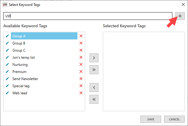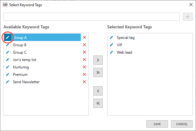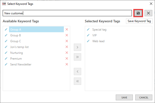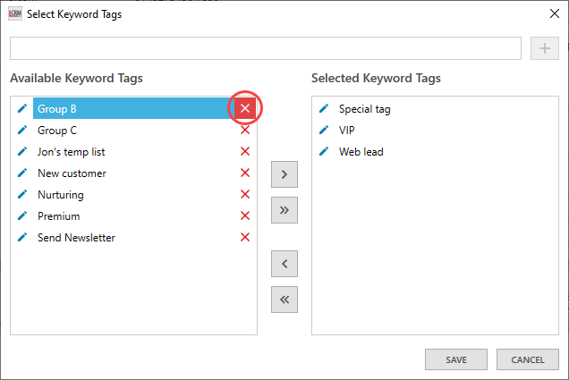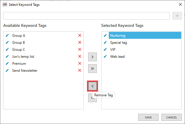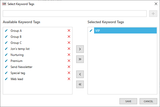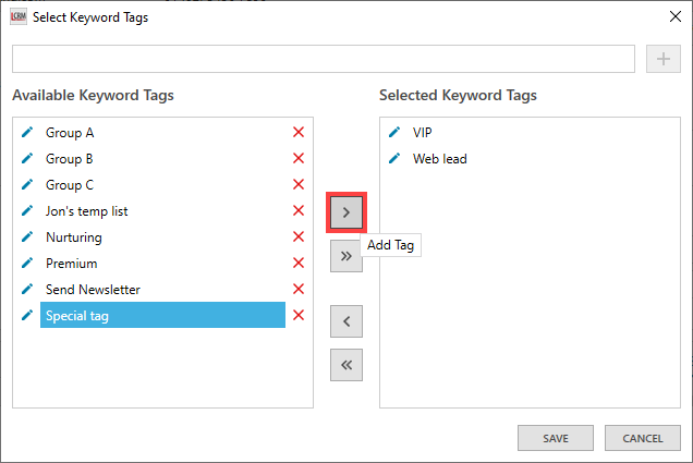 The ‘Available Keyword Tags’ list displays all the company tags you have created in Legrand CRM. Select a tag and click the first arrow to assign it to the selected company. Alternatively, use the second arrow to assign all available tags to the company.