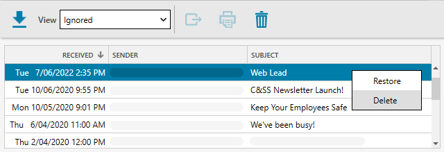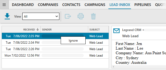Go to the Lead Inbox module in Legrand CRM and select the spam email. Right-click and select ‘Ignore’ to move the email into the spam inbox.