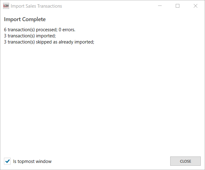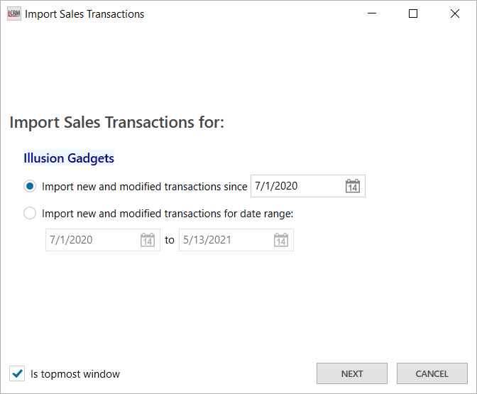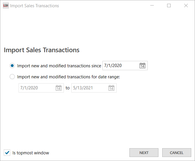 Legrand CRM enables you to import new or modified sales transactions from a given date or date range. After you select an option click ‘NEXT’ to confirm.