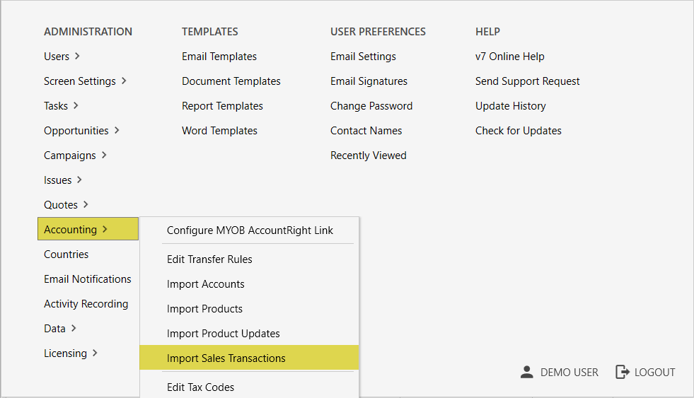 Legrand CRM enables you to import all transactions from your MYOB AccountRight accounting system into your CRM database. To import sales transactions go to the administration panel in Legrand CRM. Click on ‘Accounting > Import Sales Transactions’.
