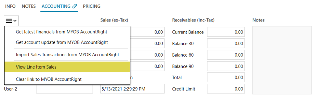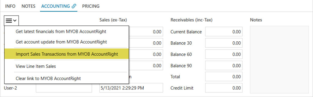 Alternatively, you can import the sales transactions for a selected company from the ‘Accounting’ tab. Go to the Companies module and select the account record from the Company List. Navigate to the ‘Accounting’ tab and click on the icon in the top left corner. Click on ‘Import Sales Transactions from MYOB AccountRight’ and select one of the import options.