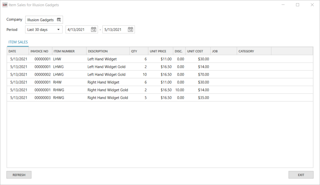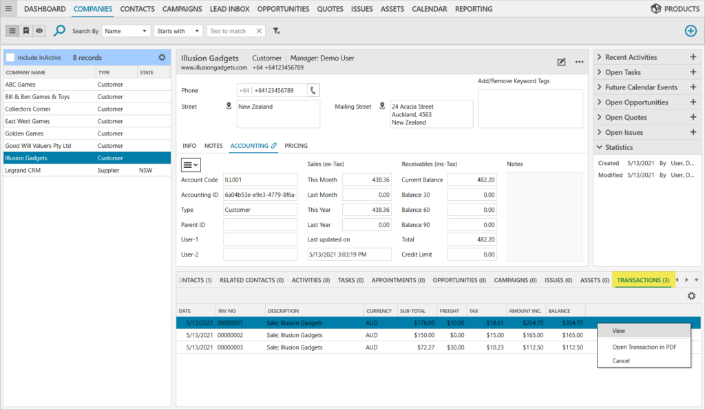 Navigate to the ‘Transactions’ tab at the bottom of the LCRM Company record to view imported sales transactions for the selected company. Double-click on a sales transaction to view the Legrand CRM invoice. You can also right-click on the transaction to view the MYOB AccountRight invoice in a PDF file.
