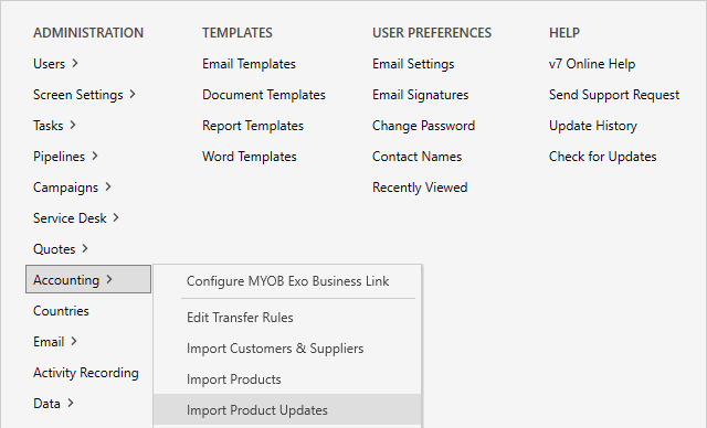 Go to the administration settings and select Accounting > Import Products to import product and services definitions from MYOB EXO into Legrand CRM.