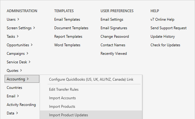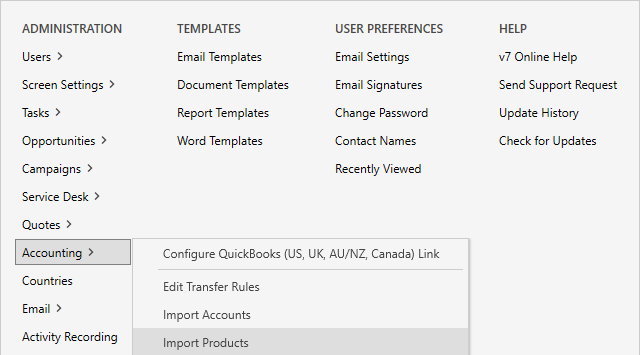 Go to the administration settings and select Accounting > Import Products to import product and services definitions from QuickBooks into Legrand CRM.