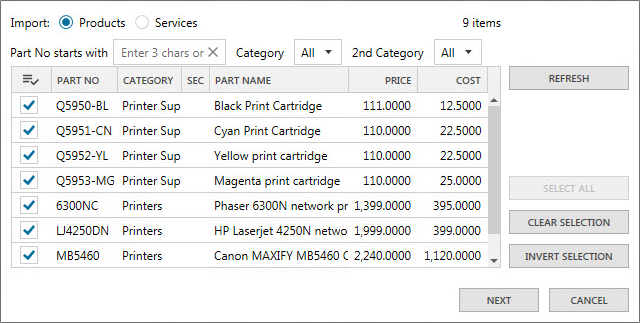 Filter between products or services and select the updated records you wish to import into Legrand CRM. Click ‘NEXT’ to confirm.