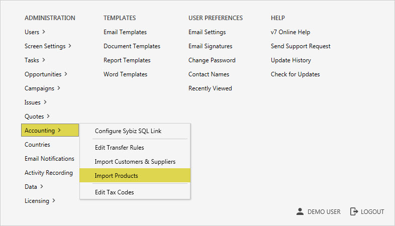 Legrand CRM’s integration with Sybiz SQL enables you to import products and services from your Sybiz account into your CRM database. Go to the administration panel in Legrand CRM and click on ‘Accounting > Import Products’.