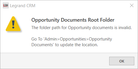 Go to the administration settings in Legrand CRM to define a path location for opportunity documents. Select Opportunities > Opportunity Documents.