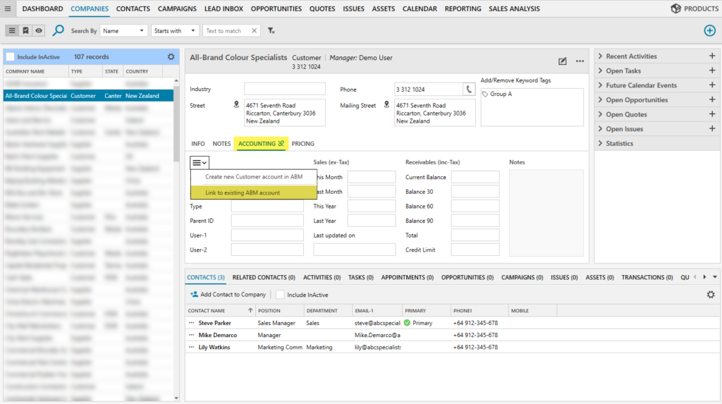 In some cases, you may have a separate Legrand CRM company record and an ABM Accounting record for the same customer. Legrand CRM enables you to link an existing ABM Account to your CRM company record. Go to the Companies module and select the company record that has not been linked to ABM Accounting. In the ‘Accounting’ tab, click on the icon in the top left and select ‘Link to existing ABM account’.
