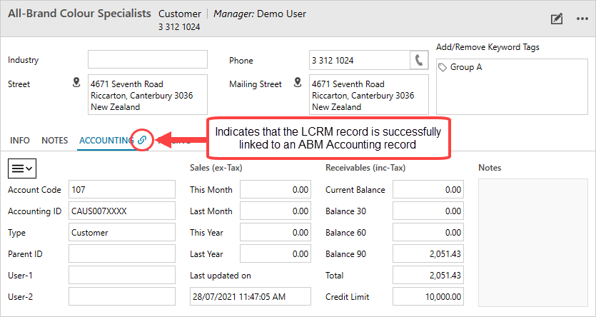 The icon next to the ‘Accounting’ tab in Legrand CRM indicates that you have successfully linked the CRM record to an ABM account. Once linked, you can view accounting information for that ABM account in Legrand CRM.