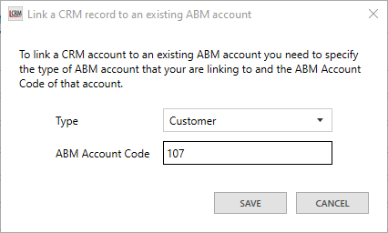 In the pop-up screen, specify the type of ABM account (i.e. Customer or Supplier) and enter the ‘ABM Account Code’ for that account. The account code is the unique number that identifies the customer or supplier. You can find the ABM account’s type and code in your ABM Accounting system. Once you enter the ABM account details, click ‘SAVE’ to link the two records.