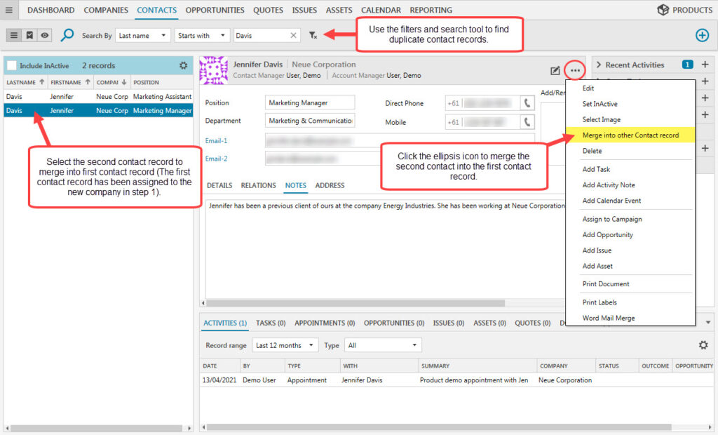 A Contact’s position or other contact details may change when they move to a new company. Merging Contacts will not change contact details. Therefore, make sure you keep a record of the Contact’s details to update if necessary.