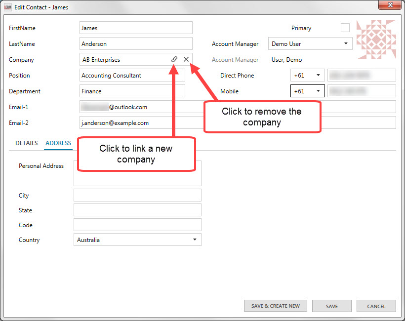 To re-assign an existing contact to a new company, go to the Contact List and click on the ‘edit’ icon for the selected contact. Click on the cross icon to remove the current company from the contact record and click on the chain icon to link the new company.
