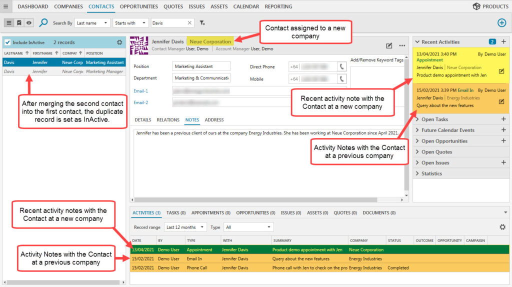 The demonstration image displays the net result of re-assigning the contact to their new company and merging the two contact records correctly. The activity notes created at the contact’s new company is moved to the original contact record. Once you merge the contacts, the second contact record will be set as InActive.