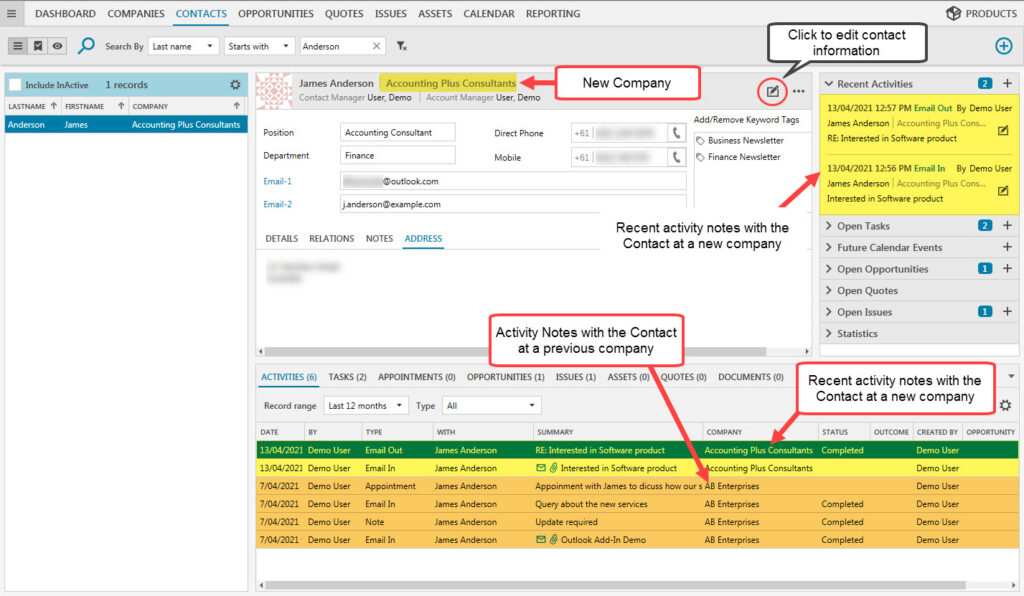 If a contact moves from one company to another, you can simply assign the existing contact to the new company in Legrand CRM. After you re-assign the contact to the new company, you can record activities with the contact that is related to the new company. The activity notes and other associated tasks created with the contact at their previous company will also be stored in the contact record. In the example, you can see the recent activity notes with the Contact ‘James Anderson’ at his new company ‘Accounting Plus Consultants’. The activity notes recorded with James Anderson at his previous company ‘AB Enterprises’ are also stored in the contact record below.