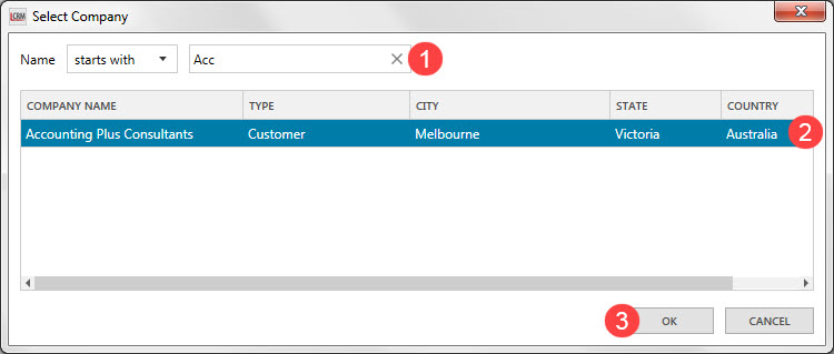 Use the filters at the top to search for the contact’s new company. Select the new company, click ‘OK’ then ‘SAVE’ in the ‘Edit Contacts’ window.