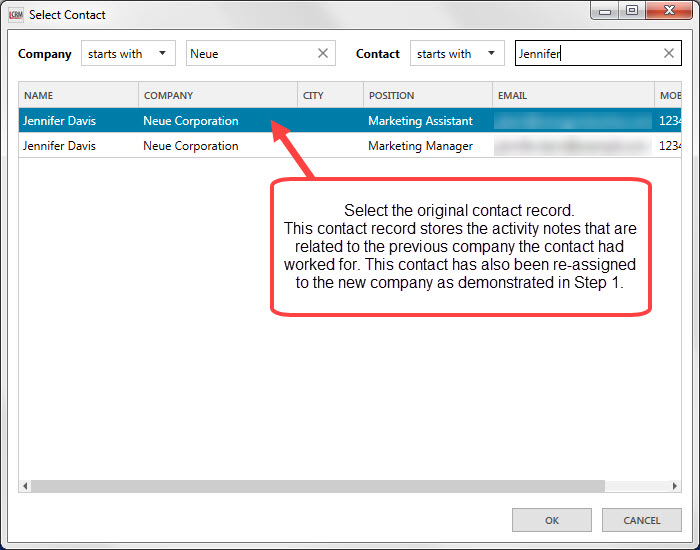 2) Then merge the second contact record into the first contact record. The net effect of the second step is to move all the activity notes created at the new company to the first contact (which was re-assigned to the new company in Step 1). Once you merge the contacts, the second contact record will be set as InActive.