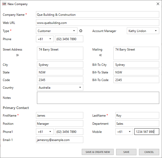 Enter the company’s information in the form and click ‘SAVE’. You can also record a primary contact when you record a company.