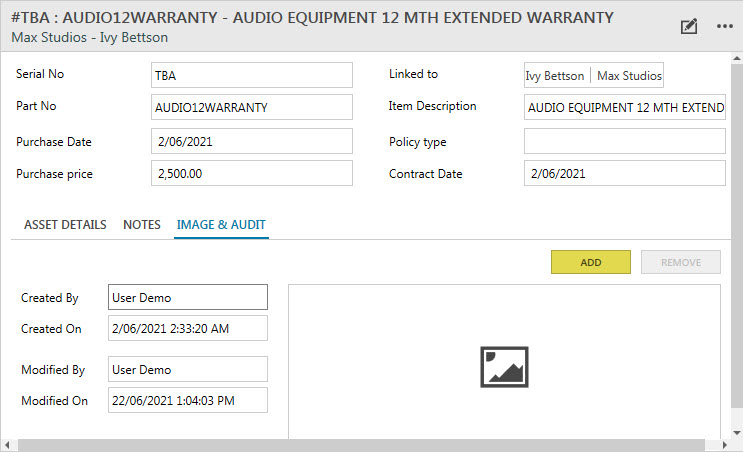 In the ‘IMAGE & AUDIT’ tab, you can add or remove images of the asset. Click ‘ADD’ and select an image from your computer to upload the image. Alternatively, click ‘REMOVE’ to delete the image.