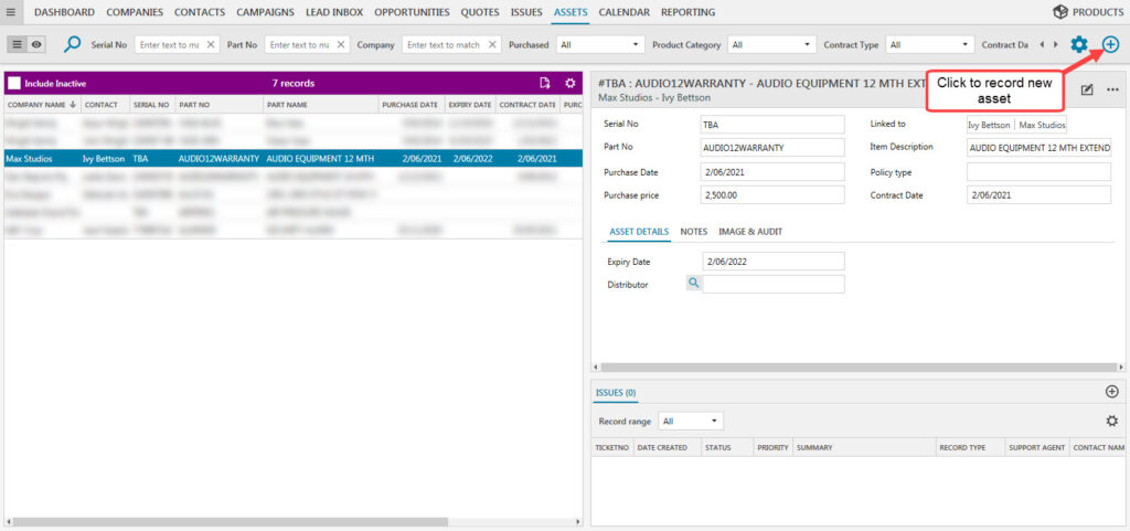 Items that have been sold by your company and used for your client’s business is displayed in the Assets module. To record a new asset, click on the icon in the top-right.