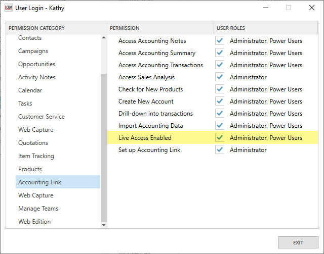 Scroll down to the permission category ‘Accounting Link’ and tick the box for ‘Live Access Enabled’.
