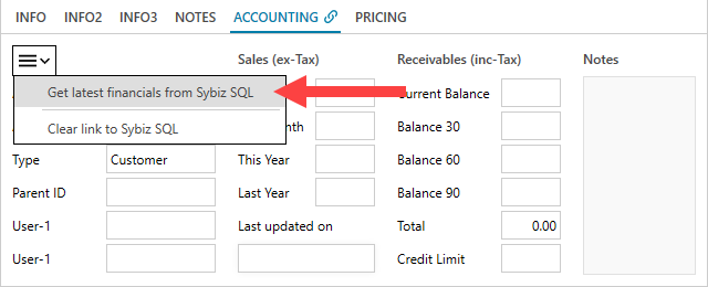 User accounts that do not have live access enabled can still retrieve financial updates from Sybiz SQL. Click on the drop-down menu in the ‘Accounting’ panel and select ‘Get latest financials from Sybiz SQL’.