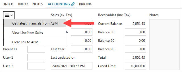 User accounts that do not have live access enabled can still retrieve financial updates from ABM Accounting. Click on the drop-down menu in the ‘Accounting’ panel and select ‘Get latest financials from ABM Accounting’.