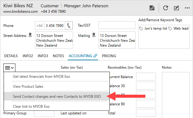 When you link a Legrand CRM Company to an MYOB EXO account, you can easily send any contact changes and new contacts to MYOB EXO.